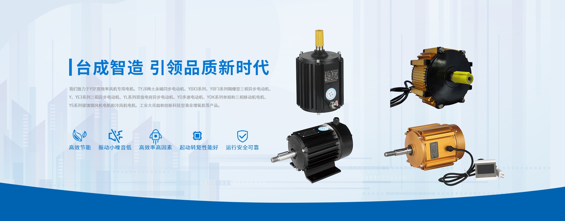 台成专业通风机电设备制造十五年。我们致力于高效率防爆电机、永磁无刷工业大吊扇、永磁增氧机电机、永磁变频电机、三相电机、工业吊扇永磁电机、高效三相异步电机、自启动三相永磁同步电机、节能异步常规电机、三相异步风冷式水车增氧机、单相异步电动机等产品的研发和制造。